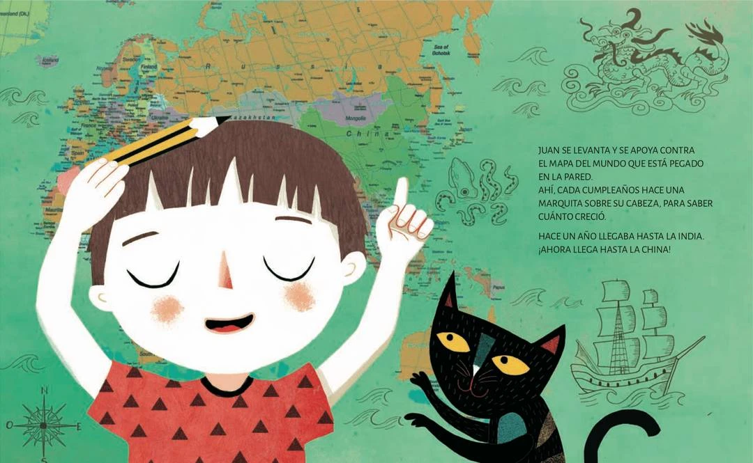 Cada cumpleaños Juan hace una marquita sobre el mapa pegado a su habitación, el año pasado llegaba hasta la India. ¡Ahora llega hasta la China! ¿Qué hará cuando sea grande y el mapa le quede chico como su remera favorita? ¿Cuántos días caben en un año? ¿Cuántos recuerdos caben en un día?