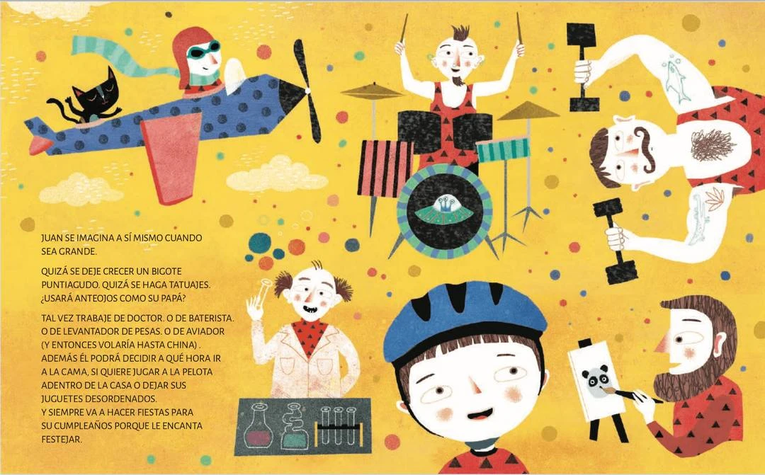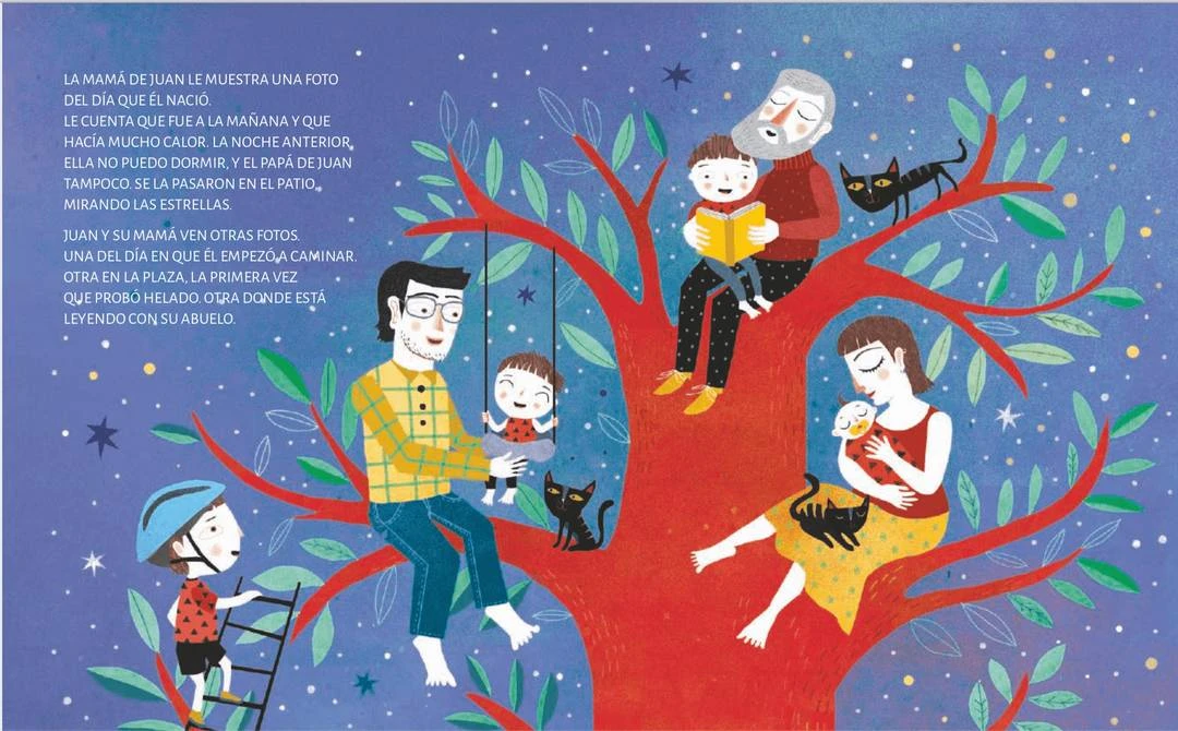 “La mamá de Juan le muestra una foto del día que él nació. Le cuenta que fue a la mañana y que hacía mucho calor”.